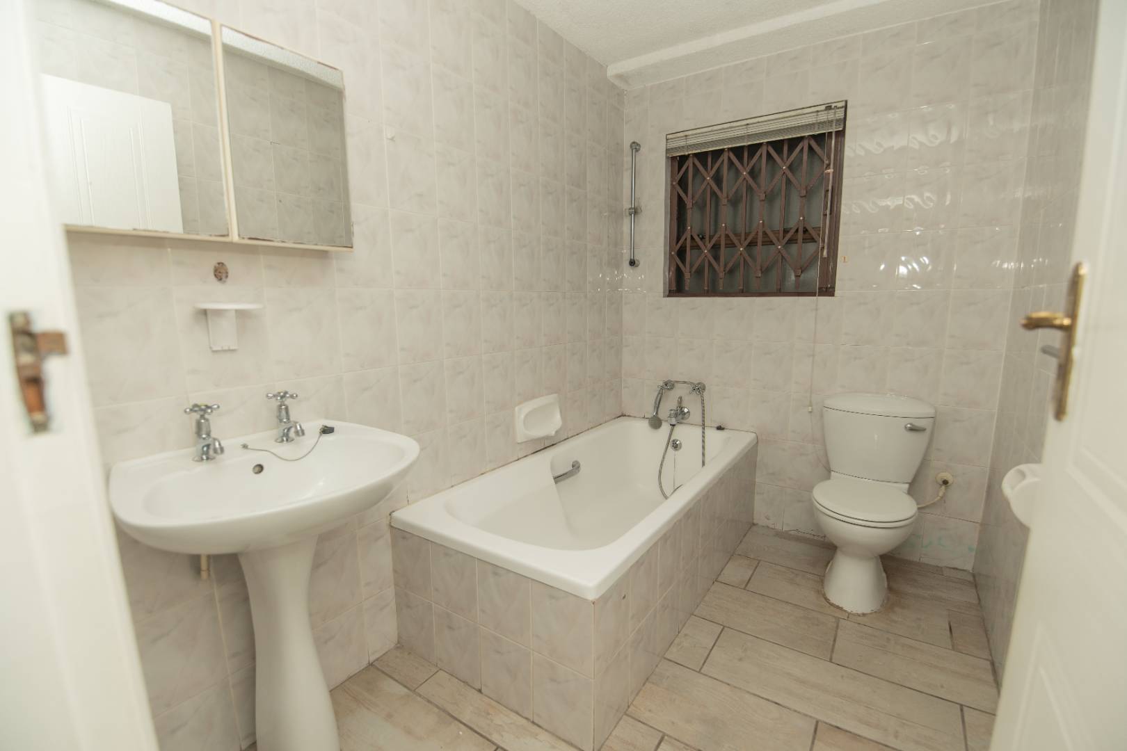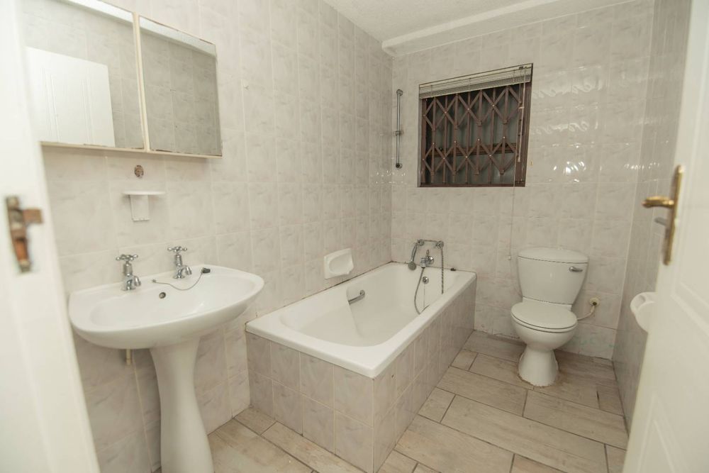 The spacious main bedroom includes built-in cupboards with a centrally positioned dressing table and an en-suite bathroom fitted with a shower, basin, and toilet. The second and third bedrooms also offer built-in cupboards and are serviced by a family bathroom comprising a bath, basin, and toilet.