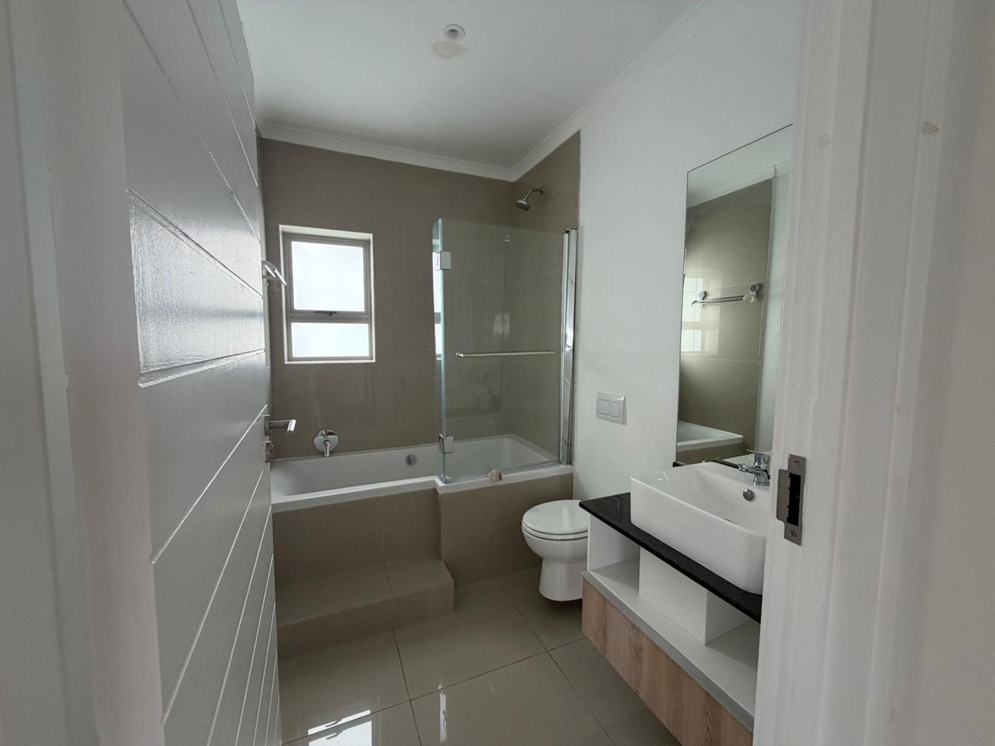 This modern townhouse offers 2 bedrooms with built-in cupboards. The main bedroom features an en-suite bathroom with shower, basin and toilet, while the family bathroom includes a bath with shower screen, basin and toilet.