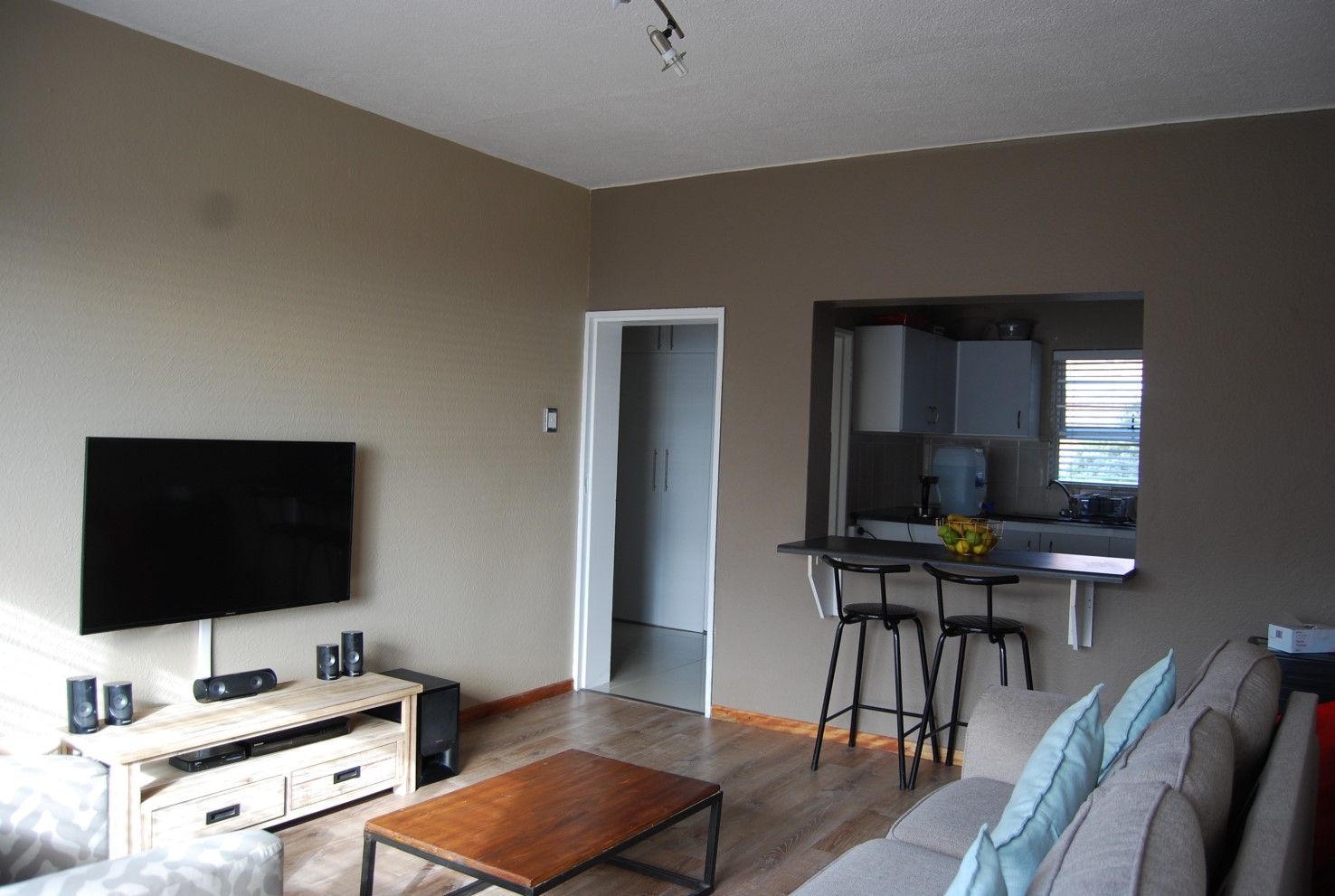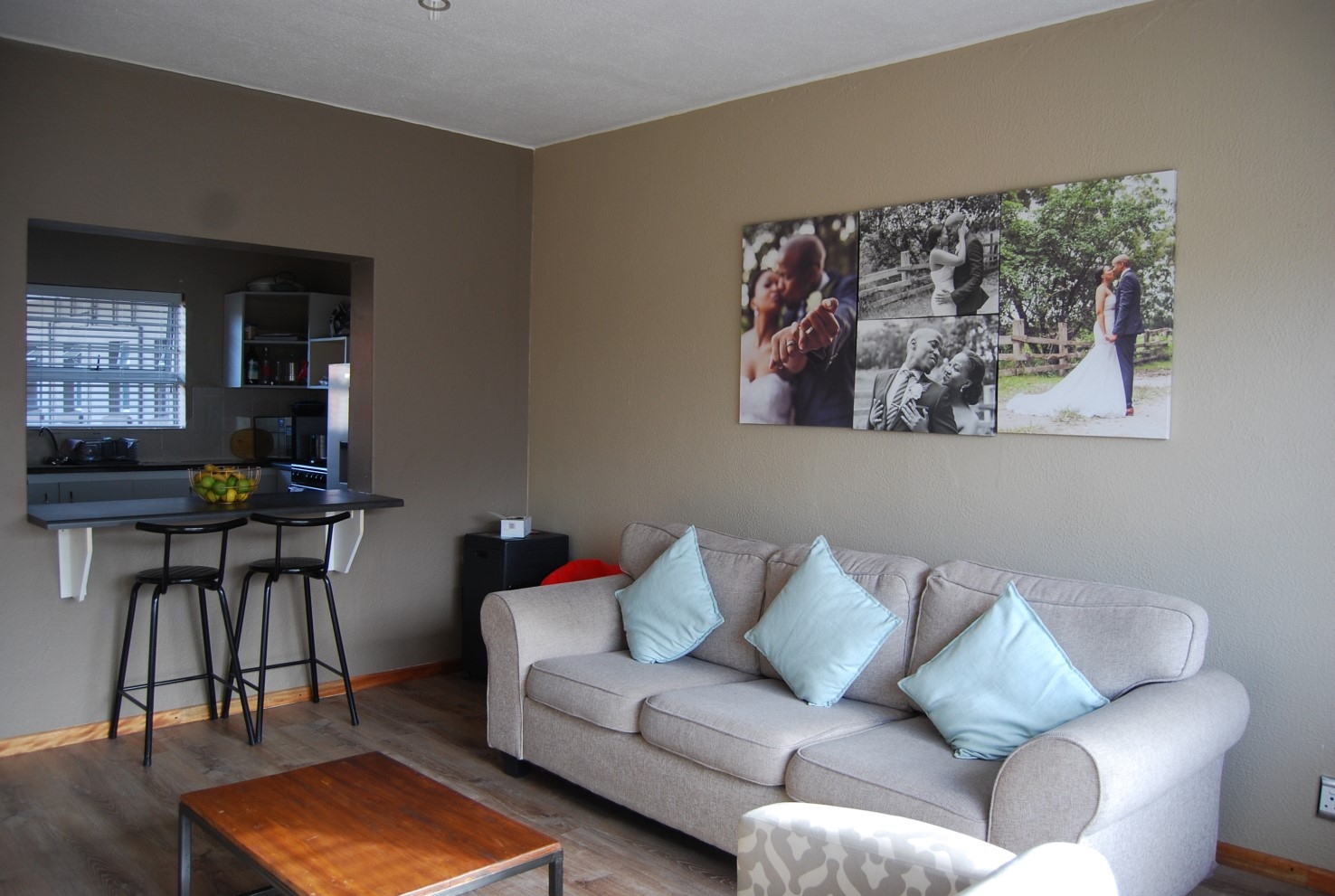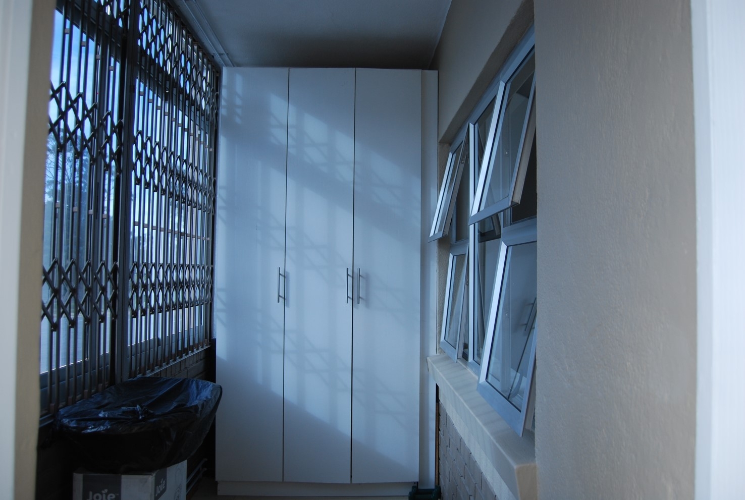 Spacious lounge with laminate flooring leading to enclosed balcony with fitted cupboards for additional storage. Trellidor fitted on balcony window.