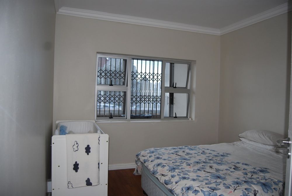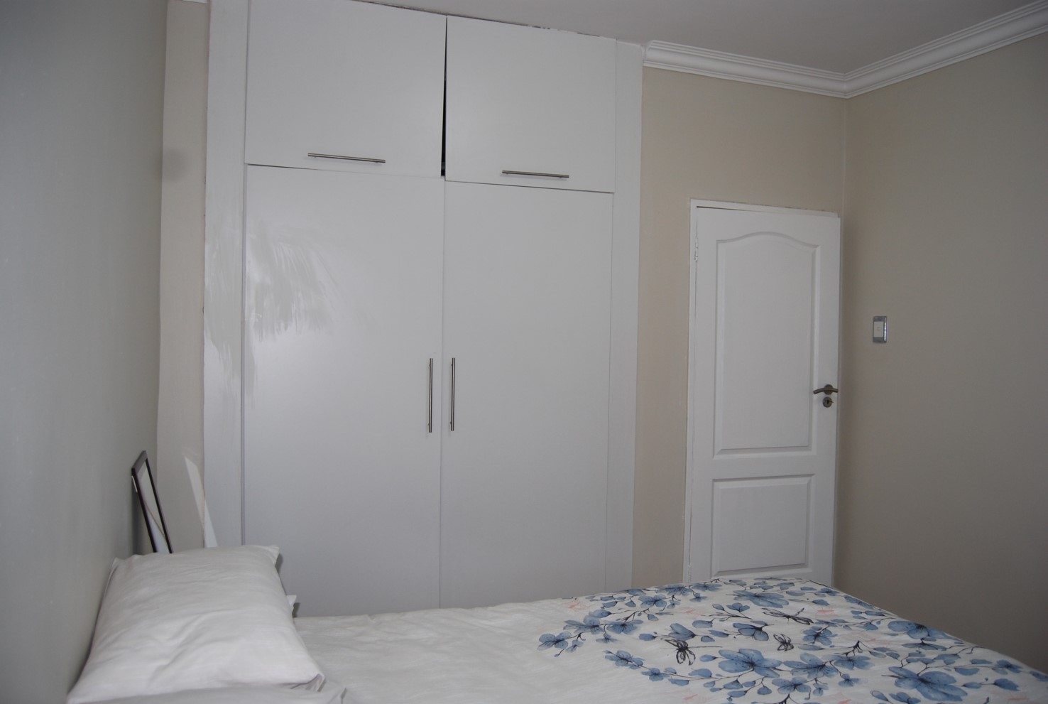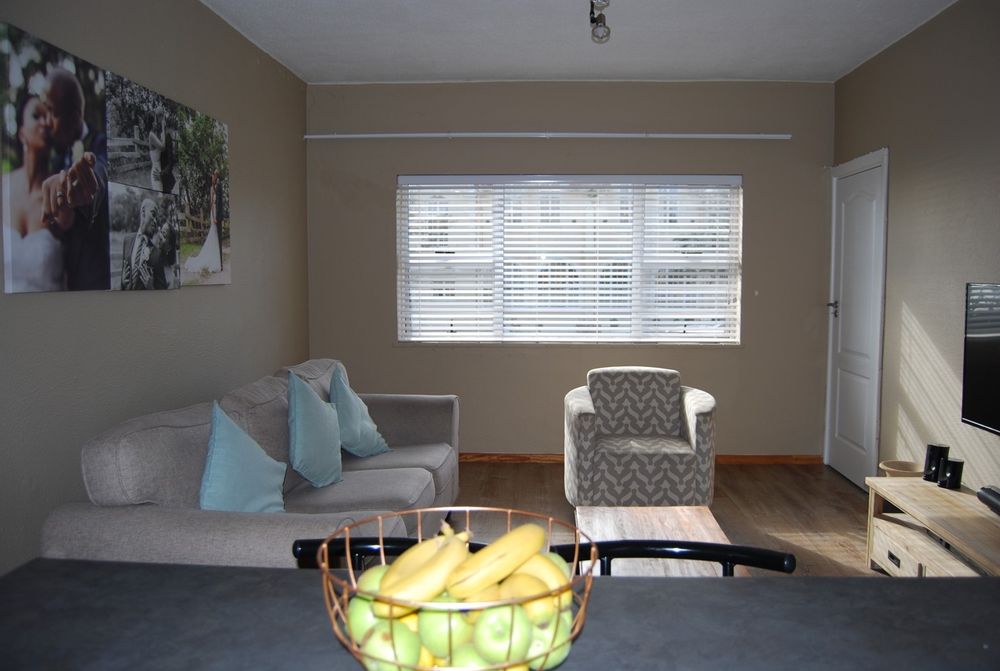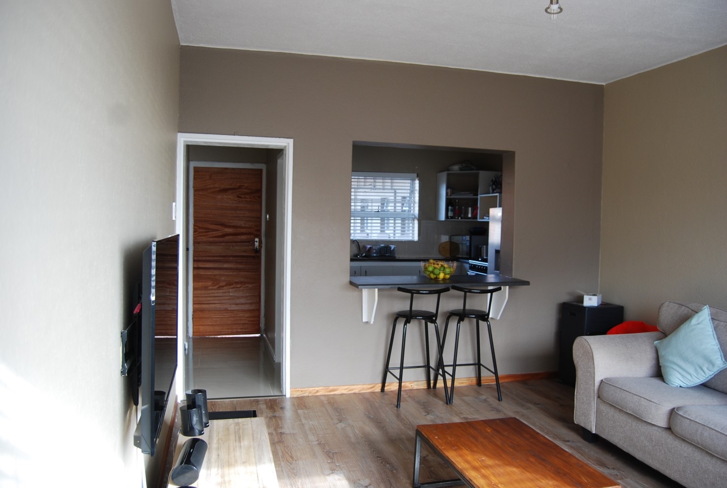 Spacious lounge with laminate flooring leading to enclosed balcony with fitted cupboards for additional storage. Trellidor fitted on balcony window.