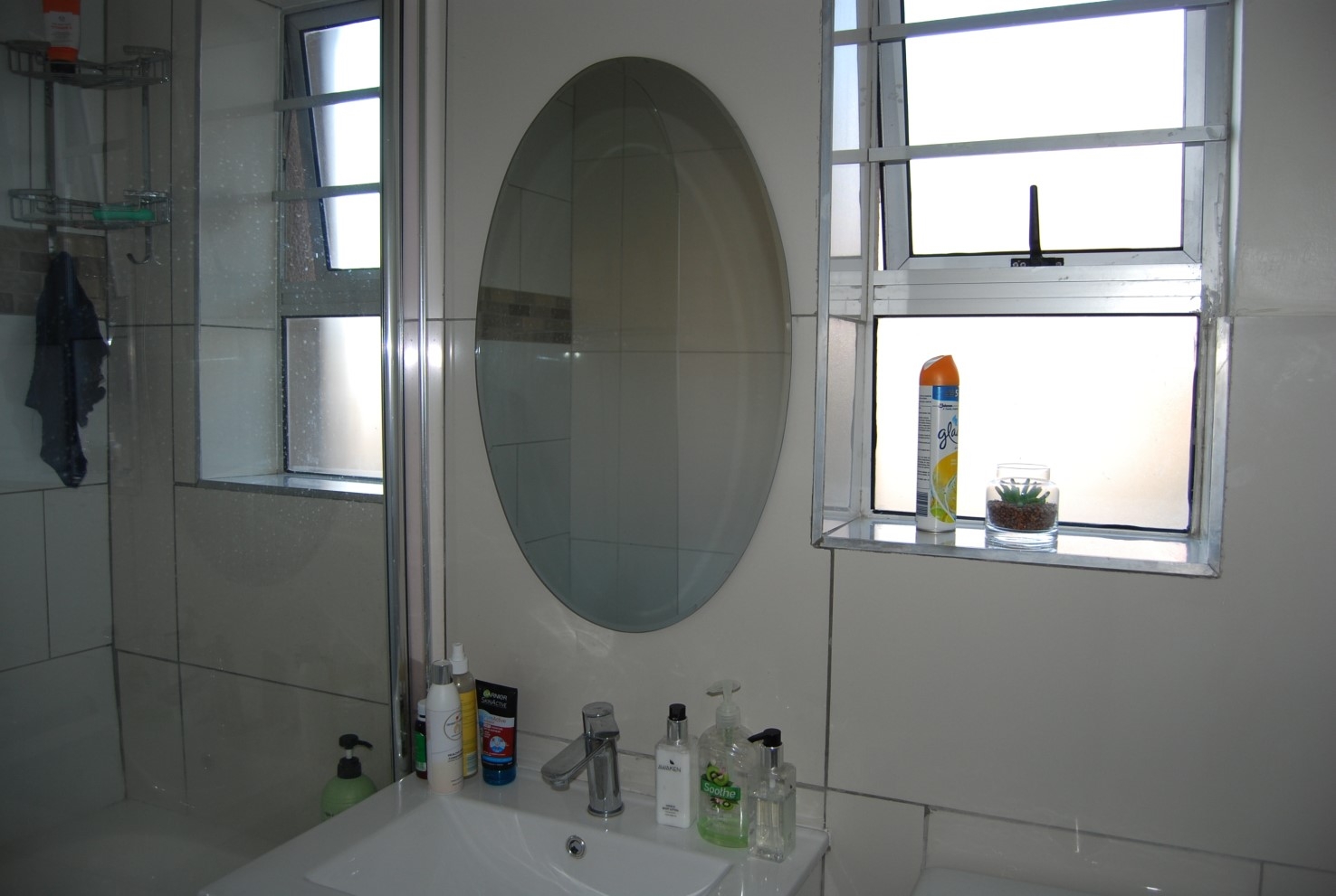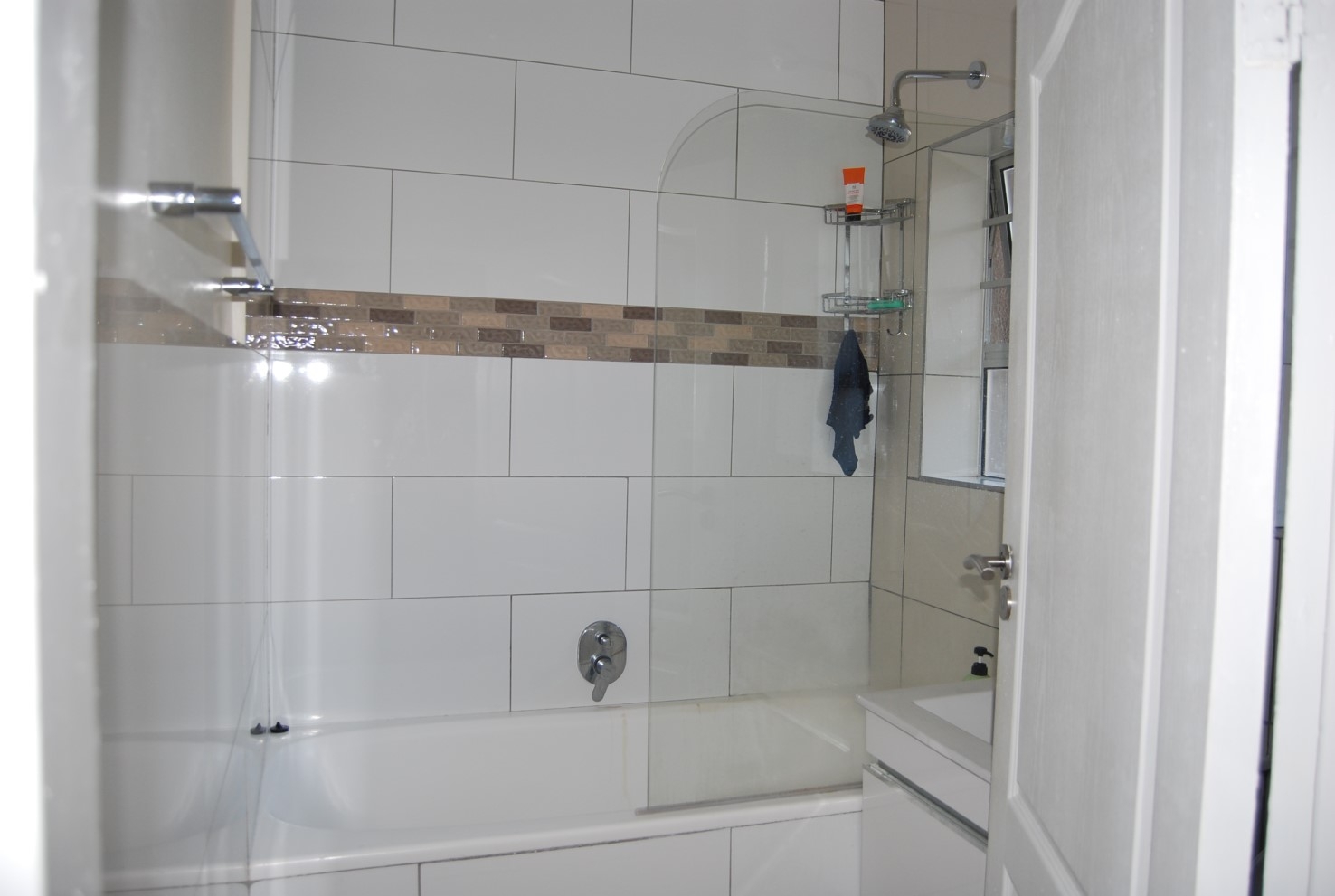 One bedroom with built in cupboards. Bathroom with bath, shower over the bath with panel, basin and loo.
