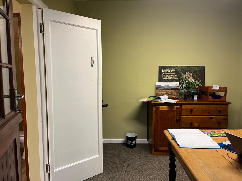 All rooms open onto a decked patio with double cottage-pane doors, overlooking a leafy, tranquil environment, creating a calm and professional working atmosphere.